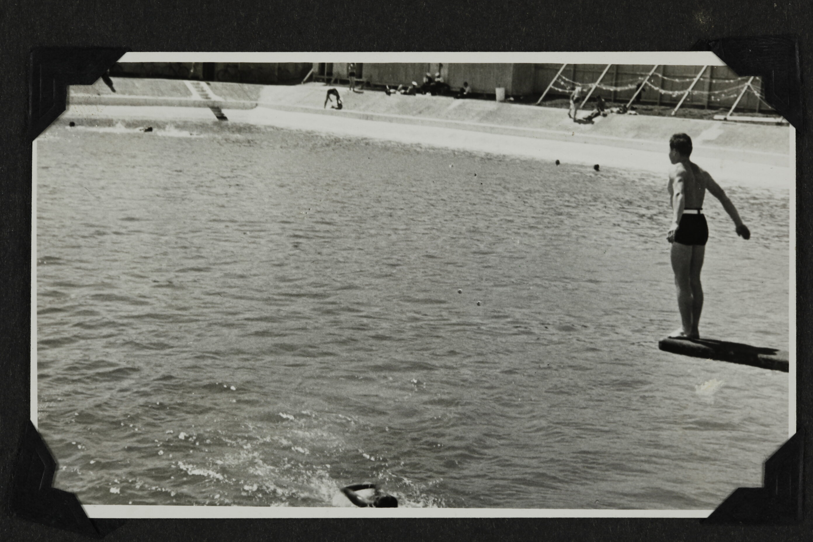 A man standing on a diving board at HMAS Cerberus (Flinders Naval Depot) around the time of World War II.