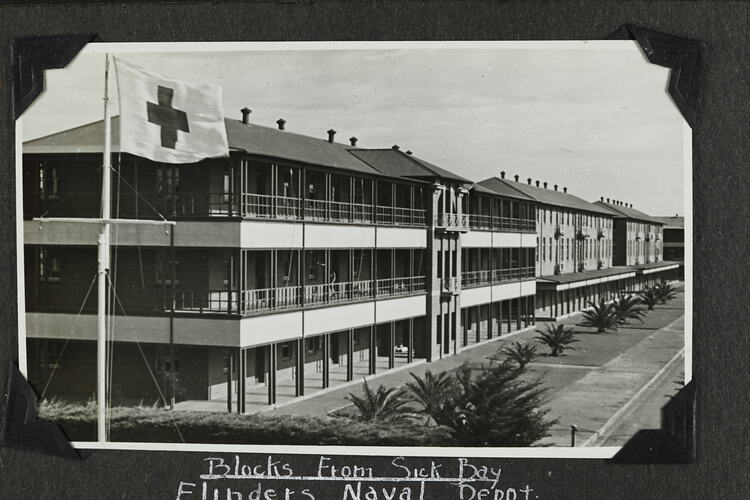 Hand written in white ink on album page; 'Blocks From Sick Bay / Flinders Naval Depot.'