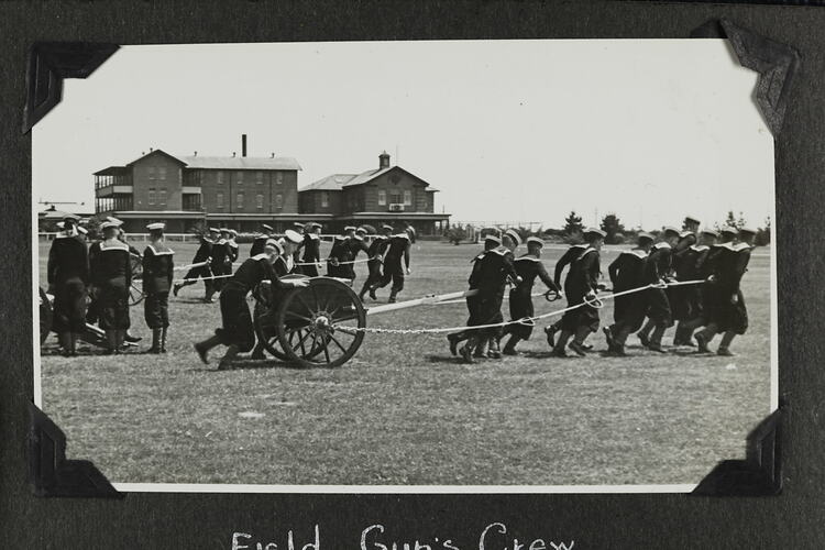 One of 48 photographs in a photographic album. Taken by D.R.Goodwin, Royal Australian Navy (R.A.N.) 1937-1939. The images are of H.M.A.S Cerberus and other naval ships, naval training and field gun crews.