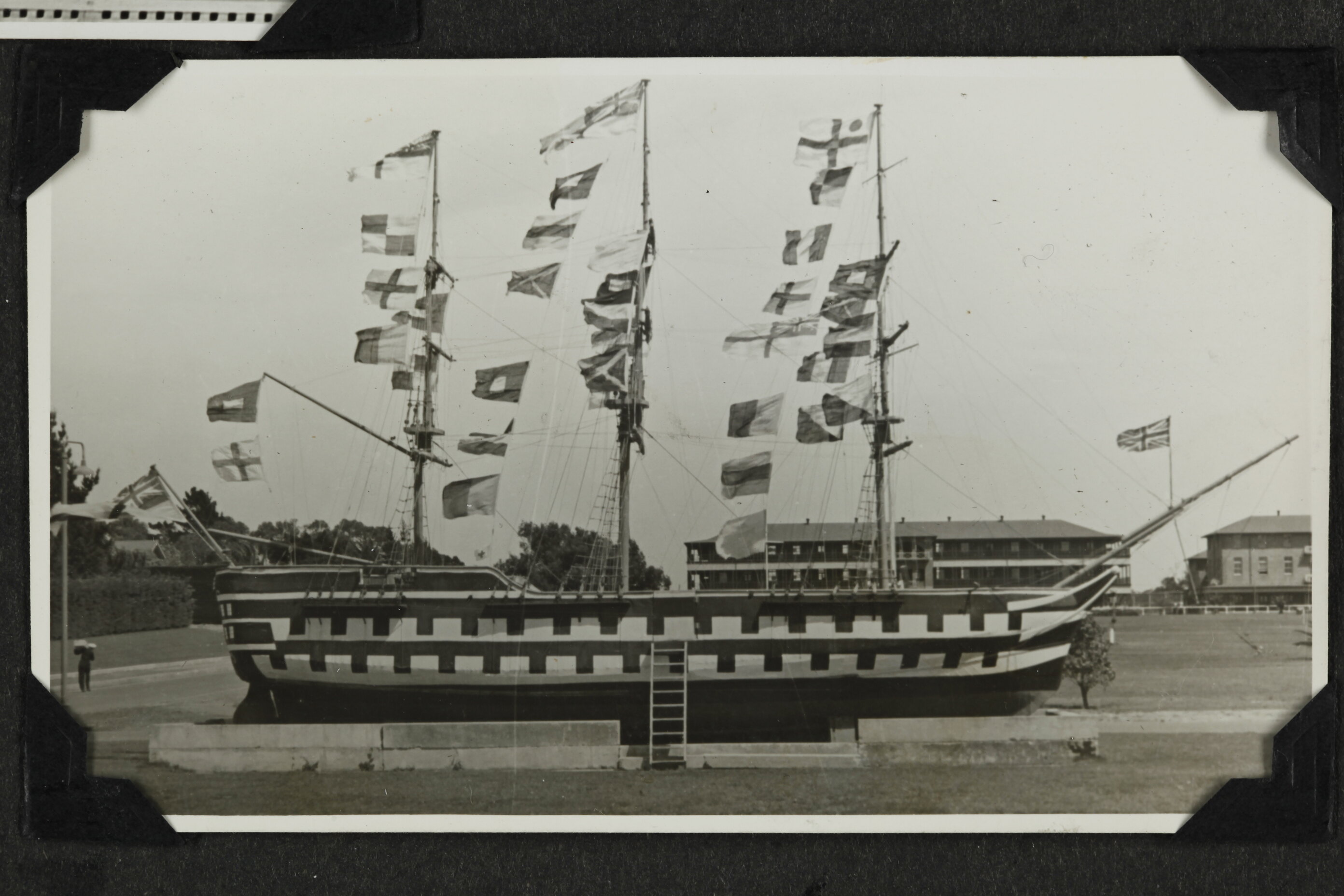 Black and white photograph of a replica of the H.M.V.S. Nelson.