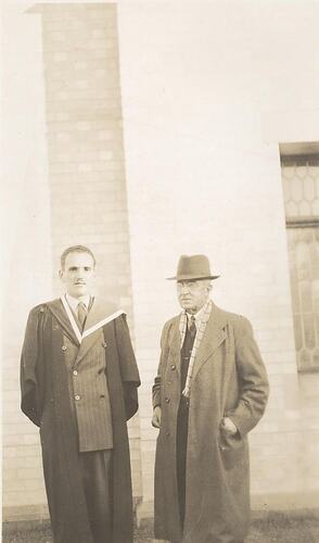Sepia image of George Gordon Junior upon conferring of his degree at Melbourne University in April 1946, with his father George Gordon Senior. George Gordon Junior was a fellow student of Hope Macpherson, the first female curator at National Museum of Victoria (now Museums Victoria).