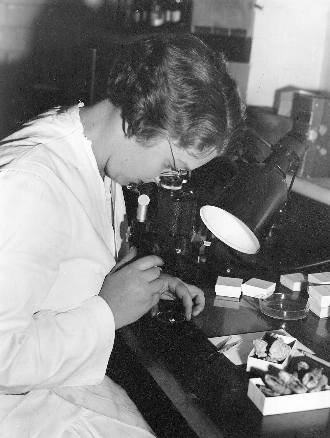 Black and white image of Hope Macpherson sitting at a workbench, wearing glasses and white coverall, looking through a microscope at a slide, lamp nearby, other shells and boxes on workbench.