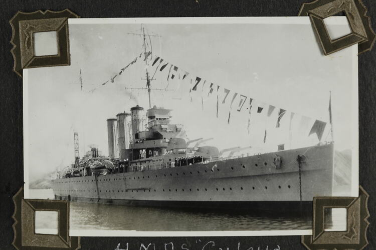 Hand written in white ink on album page; 'H.M.A.S 'Canberra.'