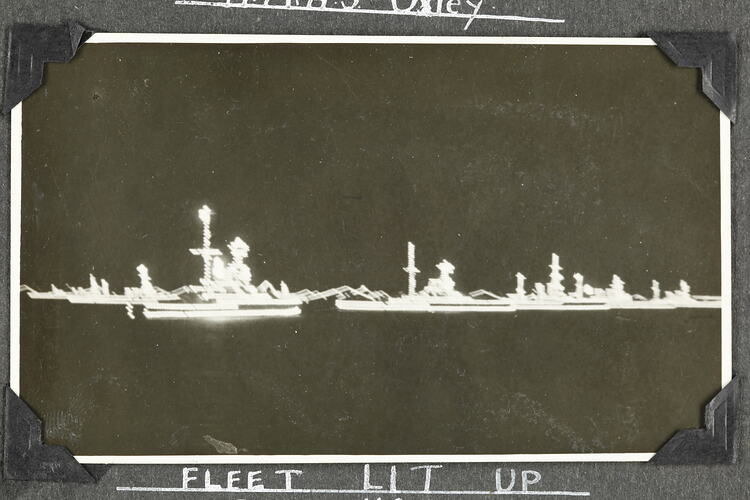 Hand written in white ink on album page; 'FLEET LIT UP AT NIGHT.'