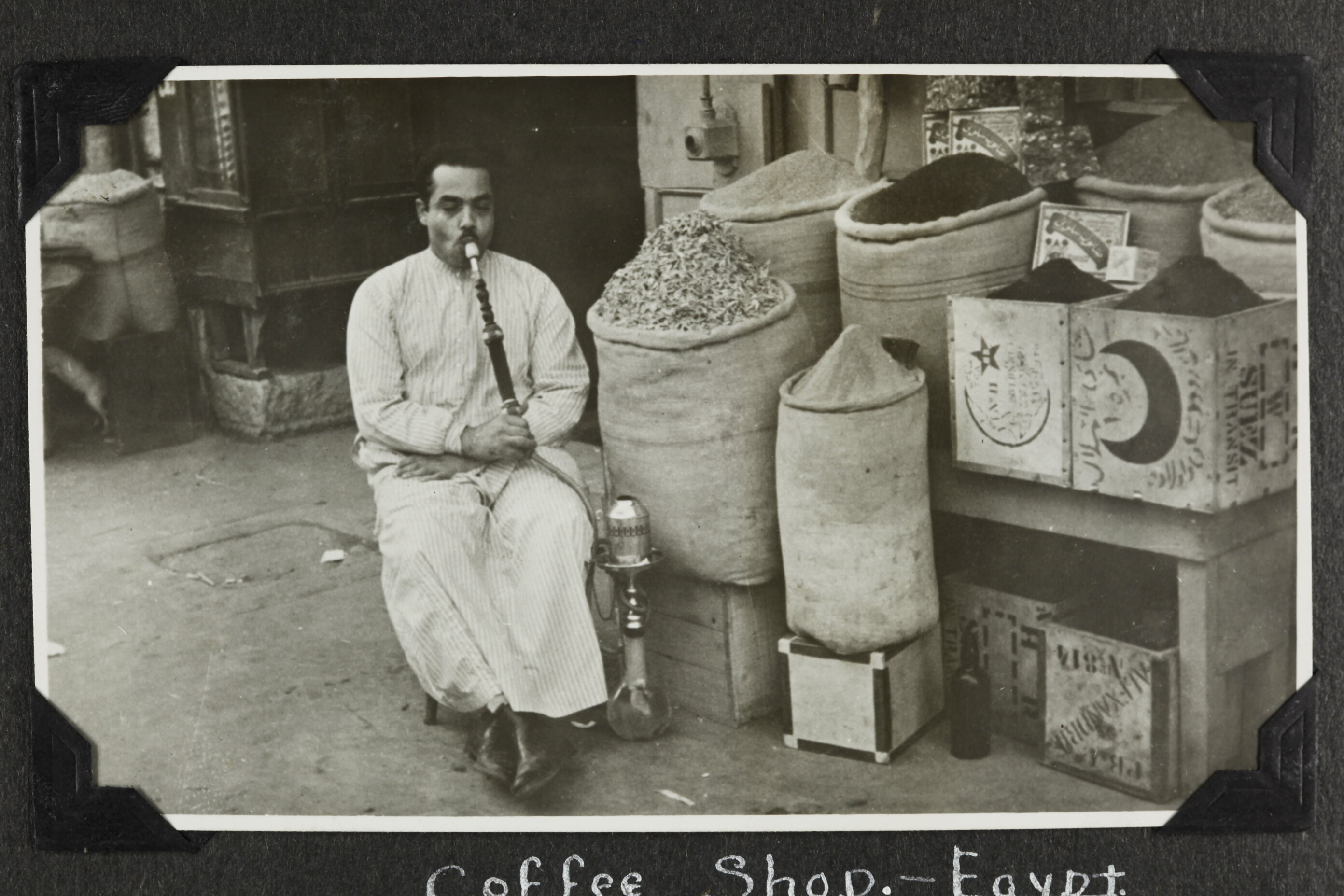 Hand written in white ink on album page; 'Coffee Shop. - Egypt.'