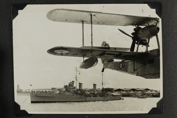 Hand written in white ink on album page; ''PLANE' COMING / DOWN NEXT TO CUISER.'