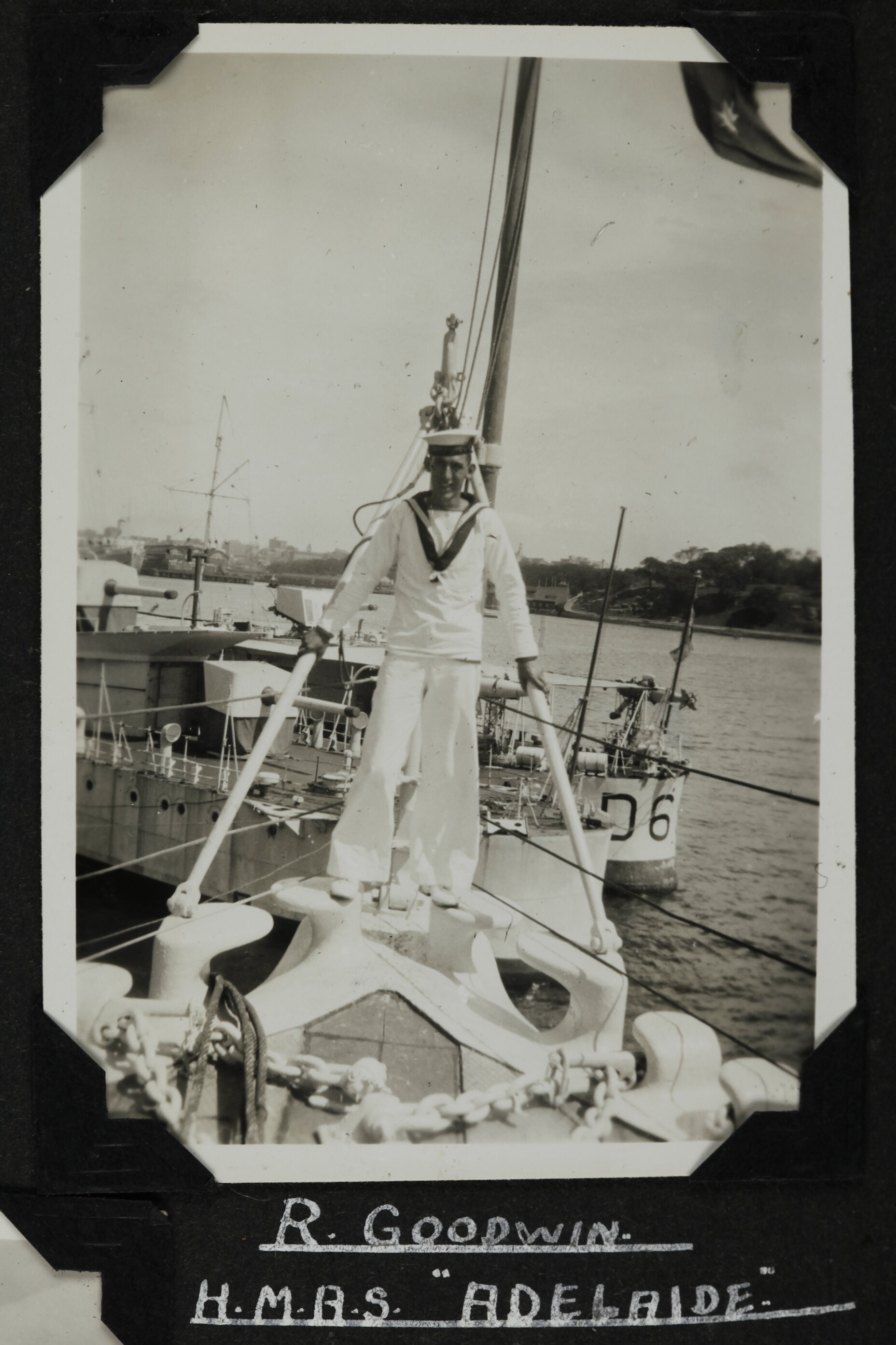 Hand written in white ink on album page; 'R. GOODWIN. / H.M.A.S. 'ADELAIDE.''