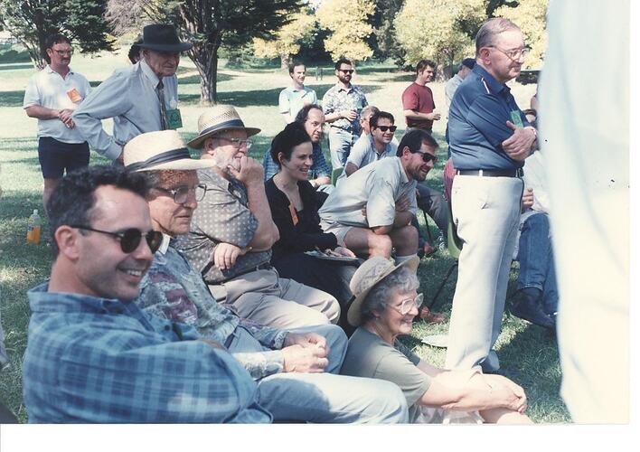 Colour image of at least 17 people mostly sitting, some standing listening to a speaker with interest and enjoyment. Person closest to camera is a male wearing blue check shirt and sunglasses. Next two gentleman sitting along from him are wearing hats and prescription glasses. Standing to the right of the image is a gentleman with arms crossed, wearing light coloured trousers, dark blue shirt and prescription glasses. In park with trees in the background.