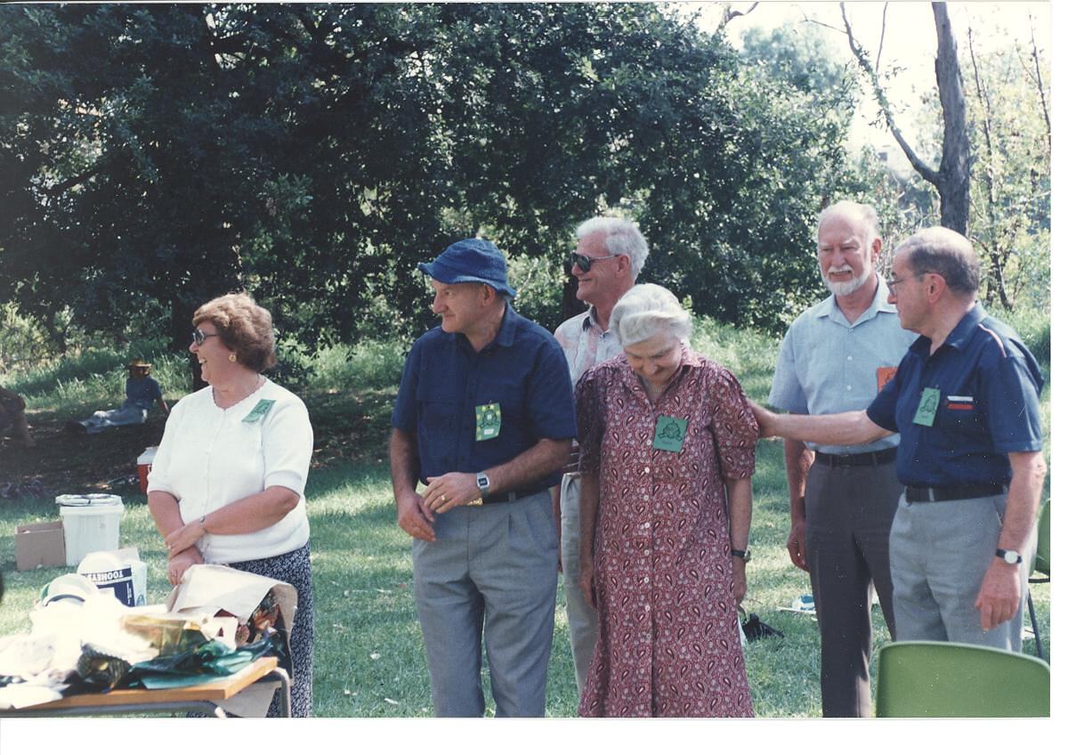 Six people standing in parkland with trees in the background. People included from left to right are: Pam and John Coventry, Len Chapman, Joyce Shaw, Arthur Neebois and Alan Beasley. Pam and John Coventry, Len Chapman and Alan Beasley all looking to the left of the image, Joyce Shaw looking at feet, Arthur Neebois almost looking straight at camera. Pam Coventry holding a bouquet of flowers and standing behind a table. John Coventry wearing blue cap, Len Chapman wearing sunglasses and Alan Beasley wearing prescription glasses.