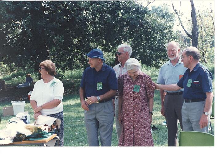 Colour image of celebration for John Coventry's 40 years service to Museum of Victoria (now Museums Victoria). Included in the image from left to right are Pam and John Coventry, Len Chapman, Joyce Shaw, Arthur Neebois and Alan Beasley, standing in a park.