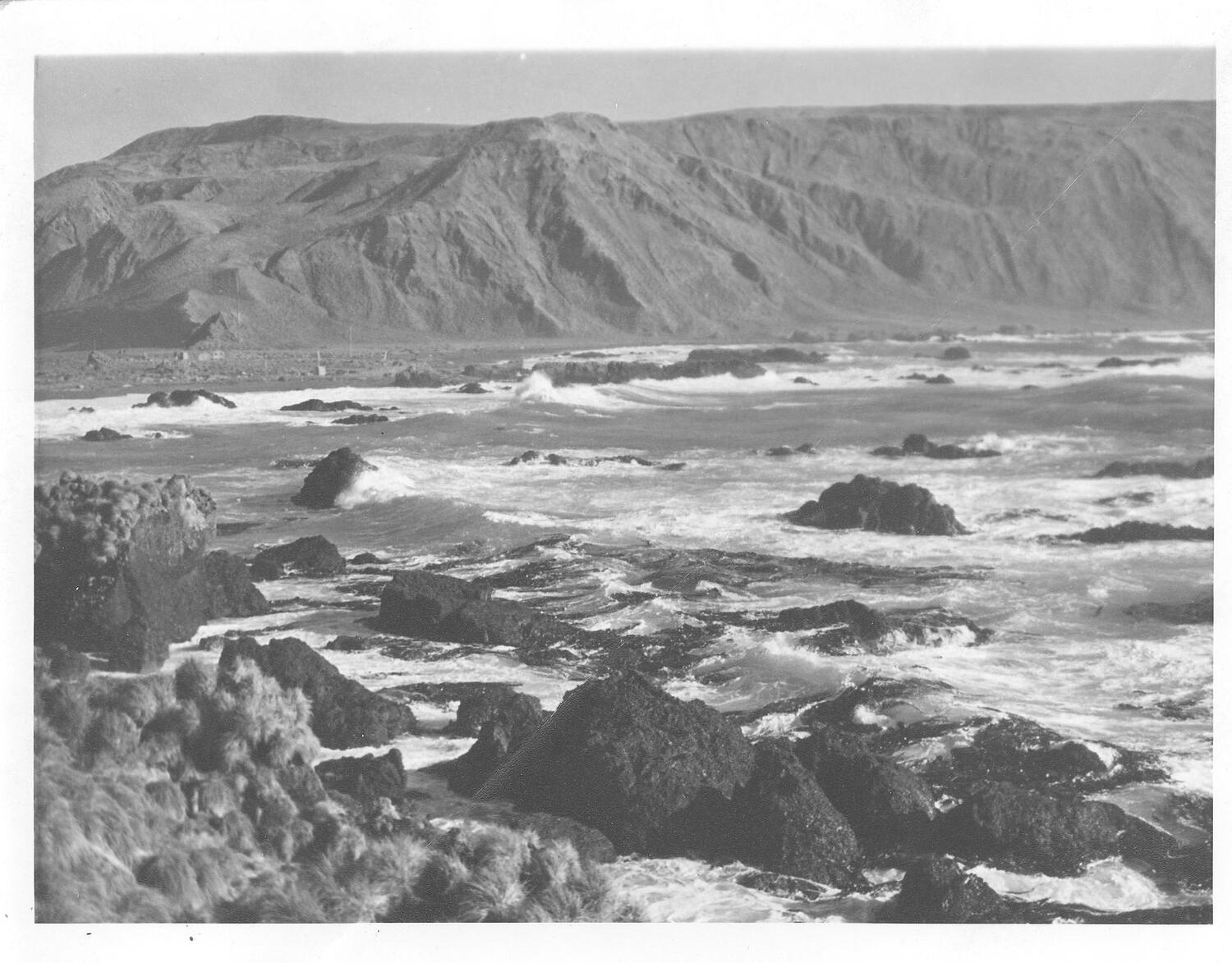 Black and white image showing barren hill in background, ocean washing over rocks along shore in middle and foreground, low vegetation in bottom left corner.