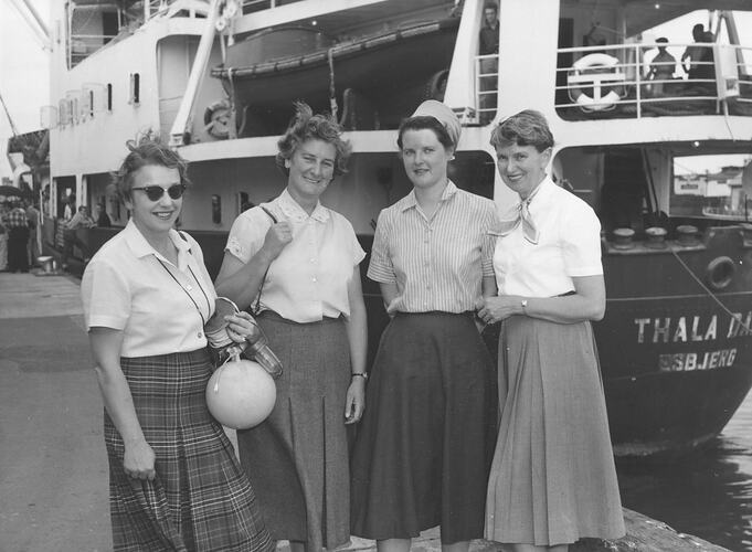 Black and white image of four ladies standing on dock in front of ship. Four ladies wearing skirts and blouses, all facing camera, one wearing sunglasses, one wearing a head scarf. Stern of the ship Thala Dan in background and name of ship can be seen on the stern.