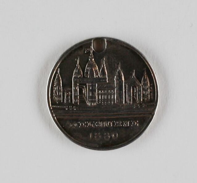A medal struck in white metal (20 mm diameter), with a hole punched through the upper margin. It features a view of the Exhibition Building from the south east, with the below text 'MELBOURNE/ 1880'. The reverse features the initials MIE entwined into a monograph; an abbreviation of Melbourne International Exhibition.