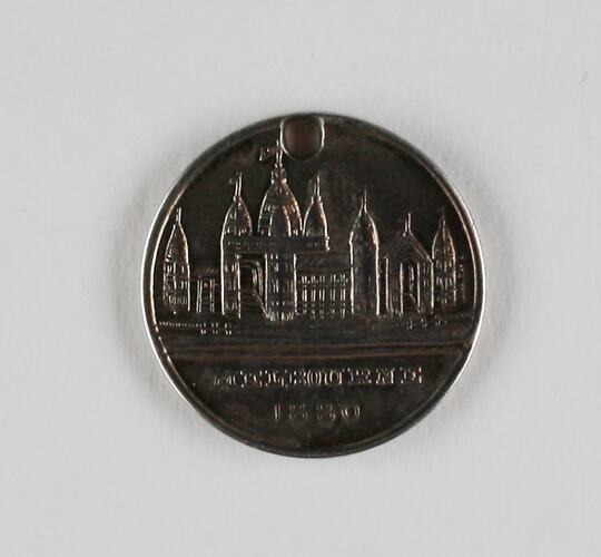 Small medallions such as this one were struck for sale to visitors to the exhibition. It features a view of the Exhibition Building as seen from the the south-east and, on the reverse, the entwined initials 'MIE', representing the Melbourne International Exhibition. It has been holed on the top margin, enabling it to be worn on a chain as a fob.