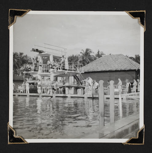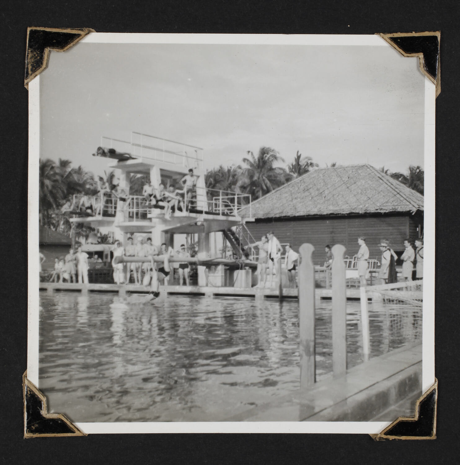 Swimming pool and diving board at the RAF base in Seletar, Singapore around the time of World War II.