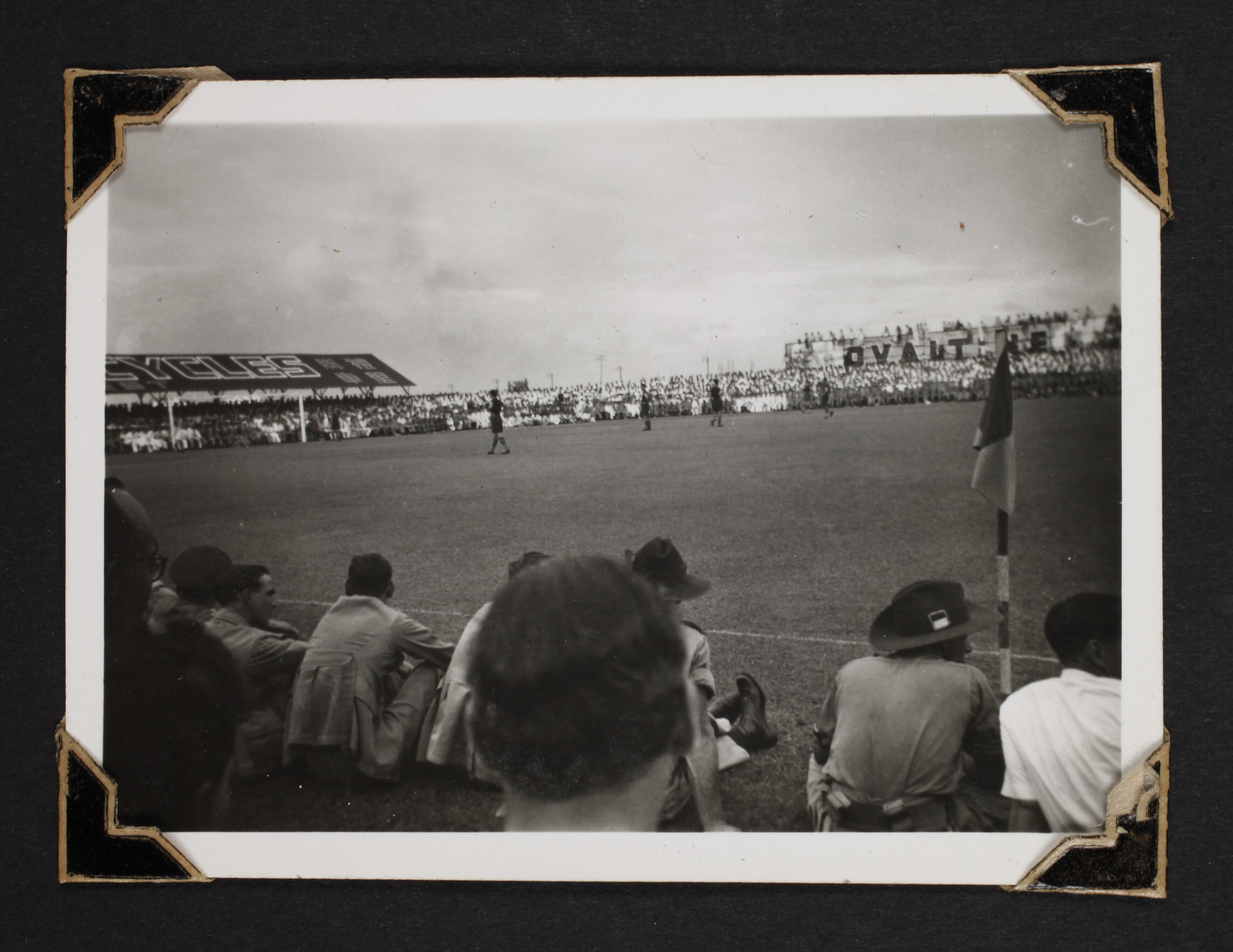 A view from the crowd of men playing a grand final soccer match at Anson Road Stadium in Singapore around the time of World War II. On one side of the stadium there is advertising for Ovaltine.