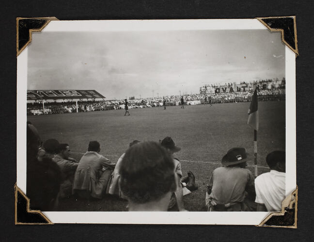Hand written in white ink on album page; 'R.A.F. VERSUS CHINESE / AT ANSON ROAD STADIUM. / GRAND FINAL SOCCER PREMIERSHIP. / (WON BY R.A.F. AFTER DRAW IN FIRST GAME.)'
