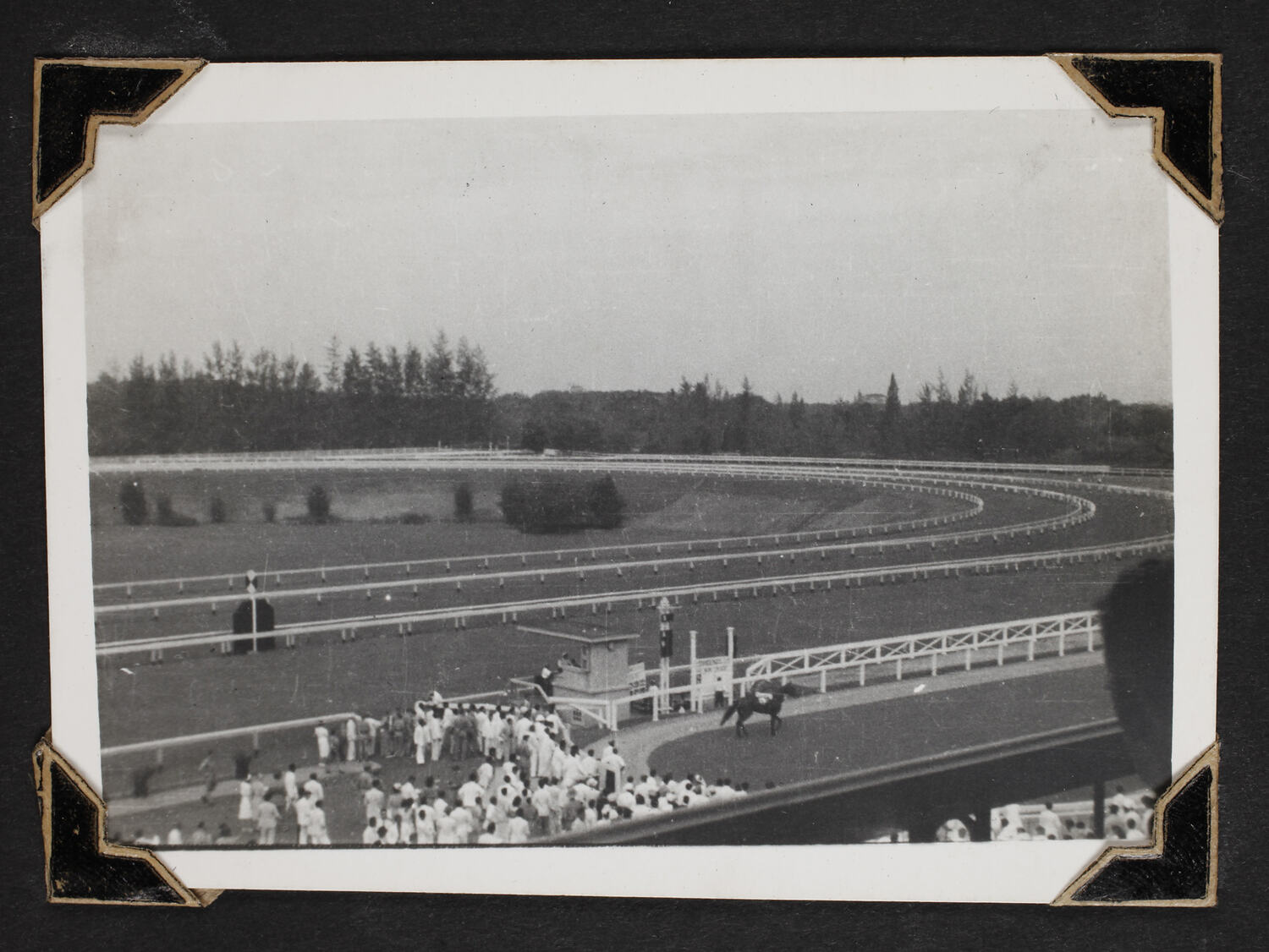 The horse racing course and crowds at Singapore Racing Club in Bukit Timah, Singapore around the time of World War II.