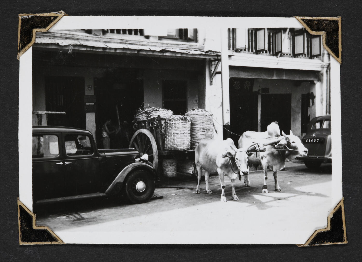 Brahman cows pullling a cart next to a modern car on North Bridge Road in Singapore around the time of World War II.