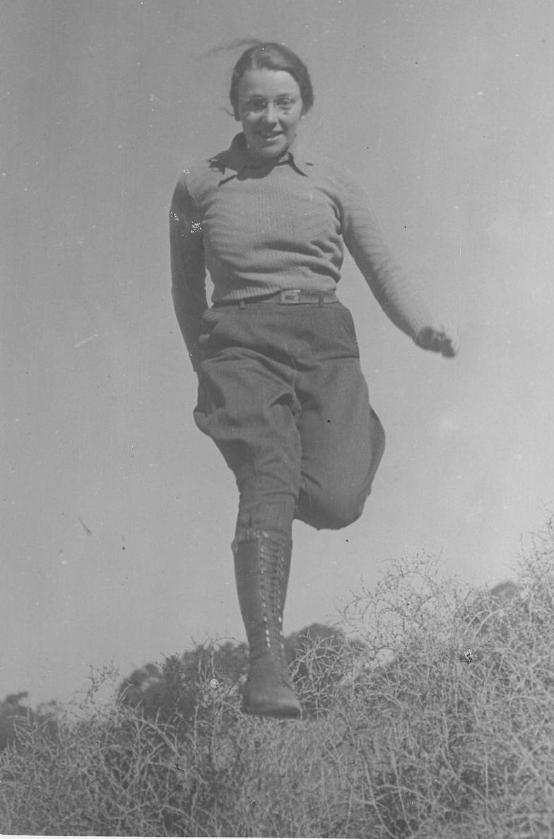 Black and white image of Hope Macpherson while running and not touching the ground. Wearing jumper tucked into jodhpurs, lace up boots that almost reach the knee and glasses. Can only actually see one leg below the knee. Background made up of foliage in lower quarter while three quarters above is clear sky. Shadows would indicate a sunny day.