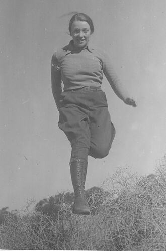 Black and white image of Hope Macpherson running, suspended in mid air. Hope Macpherson was the first female curator at National Museum of Victoria (now Museums Victoria). Hope Macpherson along with Isobel Bennett, Susan Ingham and Mary Gillham were the first women to visit the Antarctic in their December 1959 expedition.