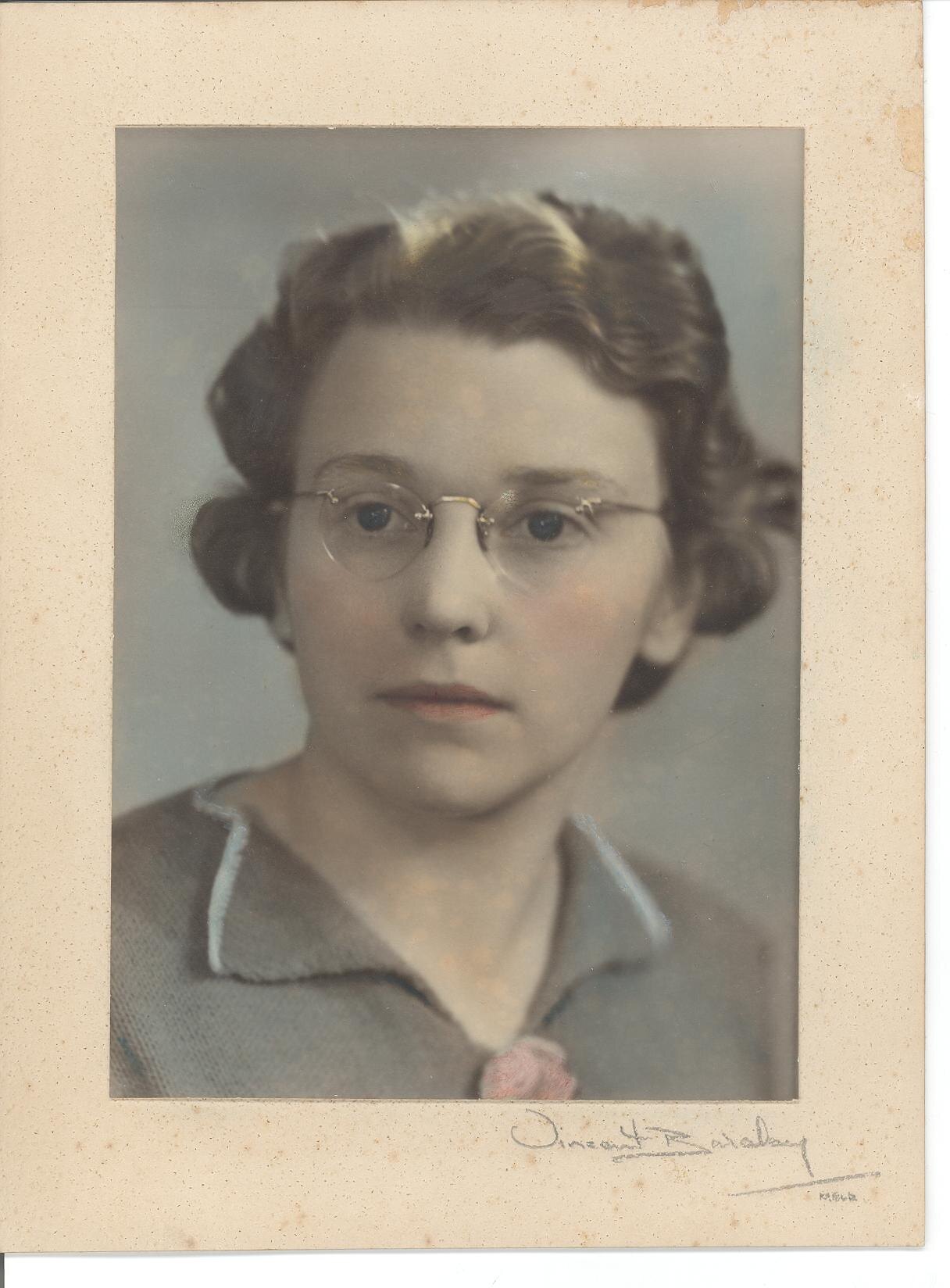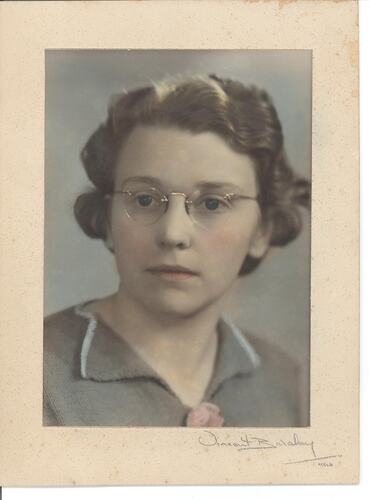 Colour portrait of Hope Macpherson wearing a knitted top light olive green, collar edged in a lighter colour, pink bow in front on neck line, wearing glasses and not smiling. Image mounted on off white backing card that has some foxing and inscription Vincent Barclay, Melbourne.
