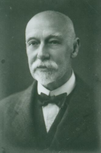 Portrait of a man, focused on the head and shoulders. The man is angled to the camera, is wearing a three-piece suit and a bow tie. He has a goatee beard and moustache.