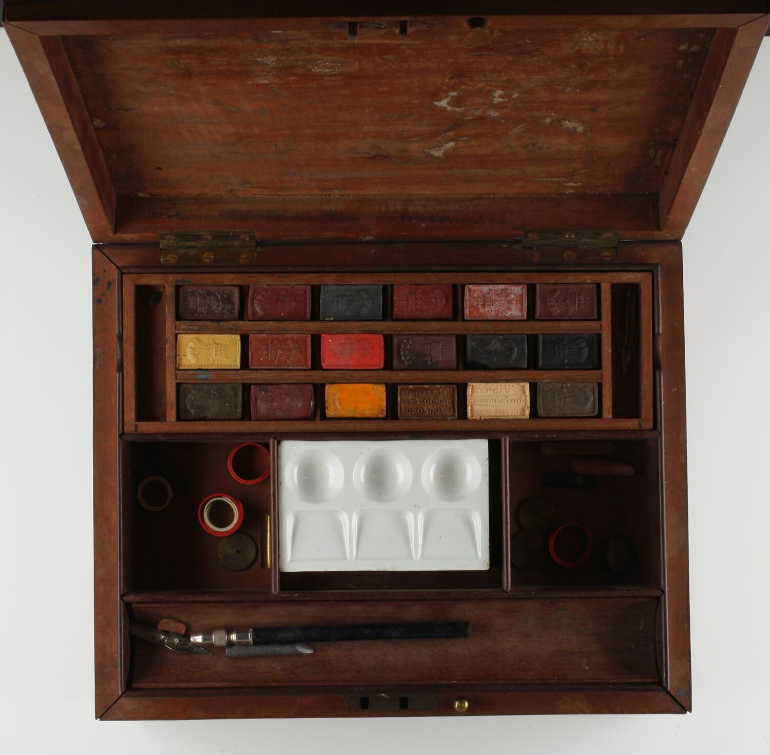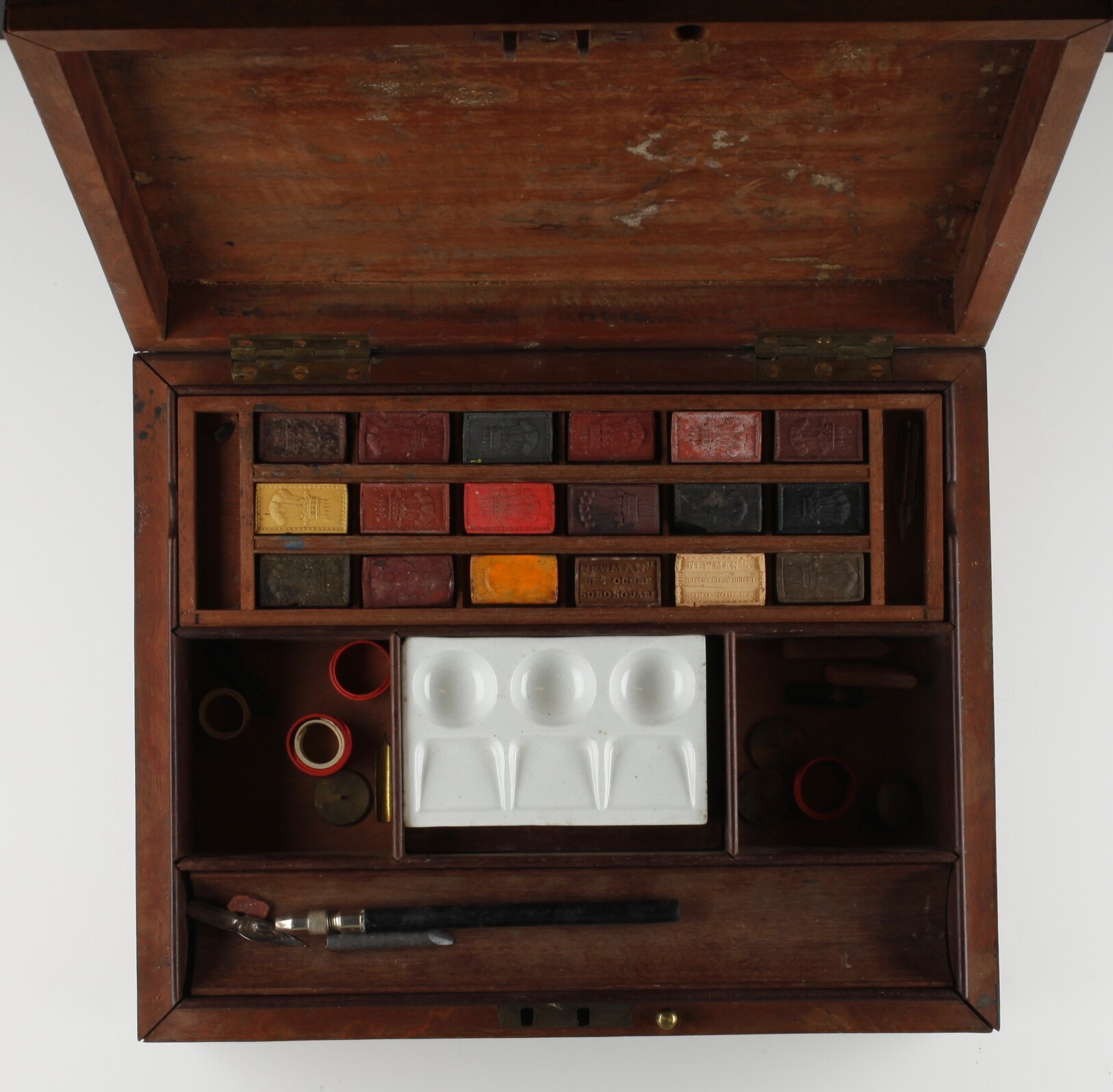 Wooden paint box with hinged lid and accessories. Original paper label inside lid has been removed. Inside box is a removable tray containing compartments for 18 cakes of watercolour paint. Most are unused, and still carry the original imprints from their moulds. A separate white ceramic tray with three circular depressions and three open-ended depressions would be used to mix colours. The tray is removed by pressing one end, tipping its shelf for easy removal. Another removable tray accommodates pens and pencils - a shaft for removable nibs, a thick lead, a nib and a small red eraser were housed in this tray when acquired. Two other compartments in the box contain five circular objects (three red, two white), apparently made of a polymer, that may function as paper clips. Five brass discs with pins in their centres - perhaps an early form of thumb tack - may also be used to secure paper. When the paint tray is removed, a compartment beneath is revealed containing five watercolour cakes still in their original packaging. Three more are loose, one of which is broken. A rectangular box papered with blue, with a removable lid, contains several heavy, square leads (called 'crayons' on box). A brass pin in the front edge of the box is pulled up to allow a single-compartment drawer to open at the front. The drawer contains four tubes of paint (partly used), two erasers (very worn from use), a stick of pink chalk, two wooden sticks (one thin, one thick), a small piece of chamois leather and a small white-papered rectangular box with removable lid containing 14 fine paint brush ends.