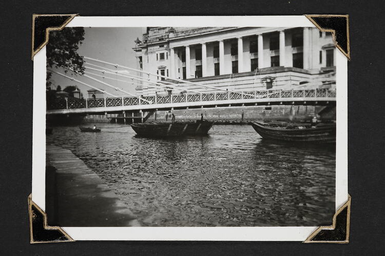 Two boats on the Singapore River sailing under a bridge. Fullarton Hotel is depicted in the background. Singapore around the time of World War II.