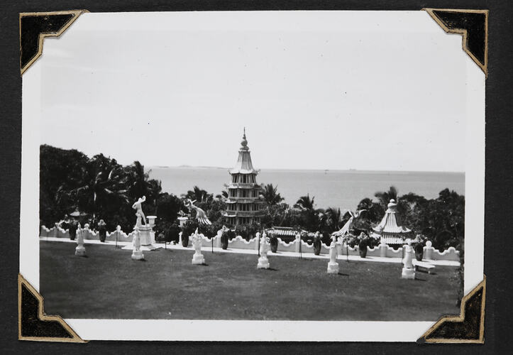 A pagoda and statues in the Chinese Gardens, Singapore around the time of World War II.