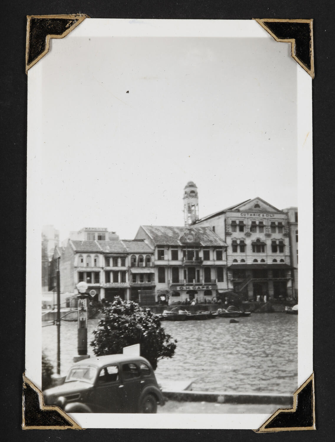 Godowns (dockside warehouses) with a river in the foreground and a tower in the background in Singapore around the time of World War II. Buildings which can be seen include those for Cuthrie & Co Ltd and the O.H. Cafe.