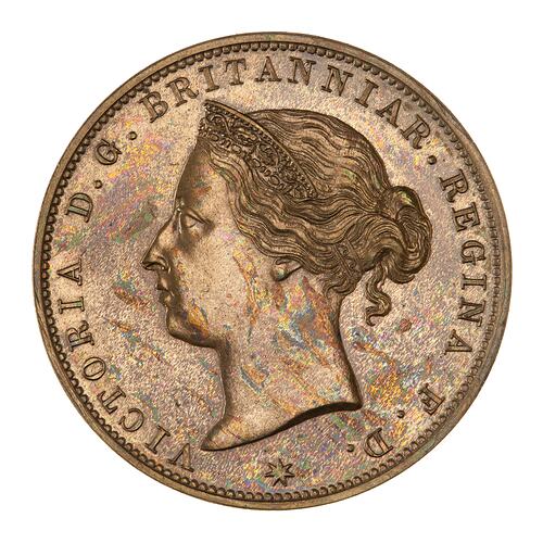 Head of the Queen facing left wearing coronet ornamented with oak leaves; around, VICTORIA D:G: BRITANNIAR: REGINA F:D:; below, a star