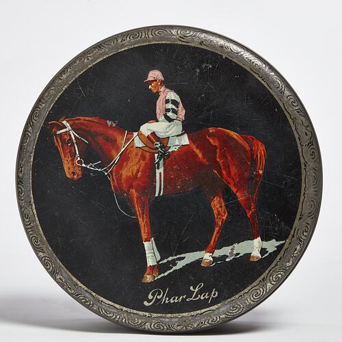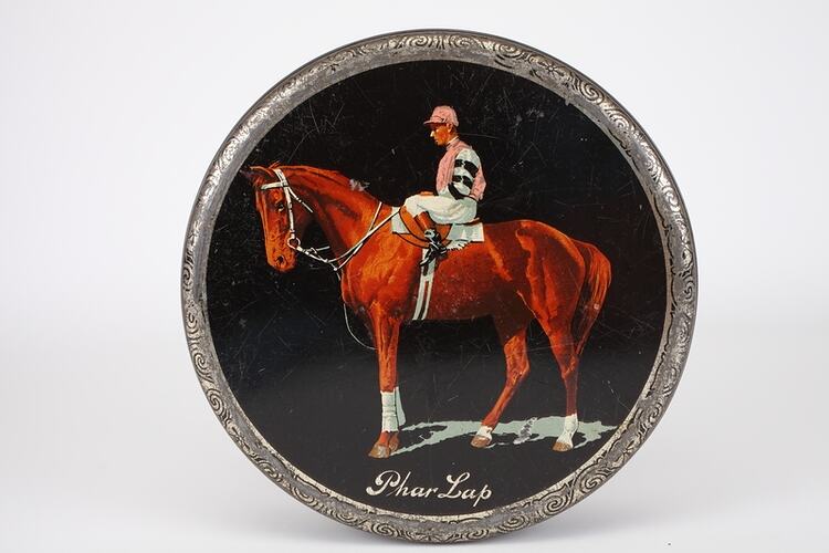 This tin is significant as an example of the huge amount of merchandising produced to capitalise on the success of the race horse Phar Lap.The enduring popularity, and marketability of Phar Lap is demonstrated through the number of mementoes and souvenirs produced during his life, and in the decades following his death. Phar Lap's life and untimely death were commemorated in numerous handcrafted and commercial products such as this, marketed to a public hungry for the opportunity to show their devotion to and admiration for `Big Red' and his amazing achievements on the track. It is an early example of the use of the name and image of an Australian celebrity to sell a product. In the days before licensing laws, companies (following the example set by Hollywood) were able to put a celebrity's name and image on any product, no matter how unrelated to them, in the hope of tempting a star-struck public.