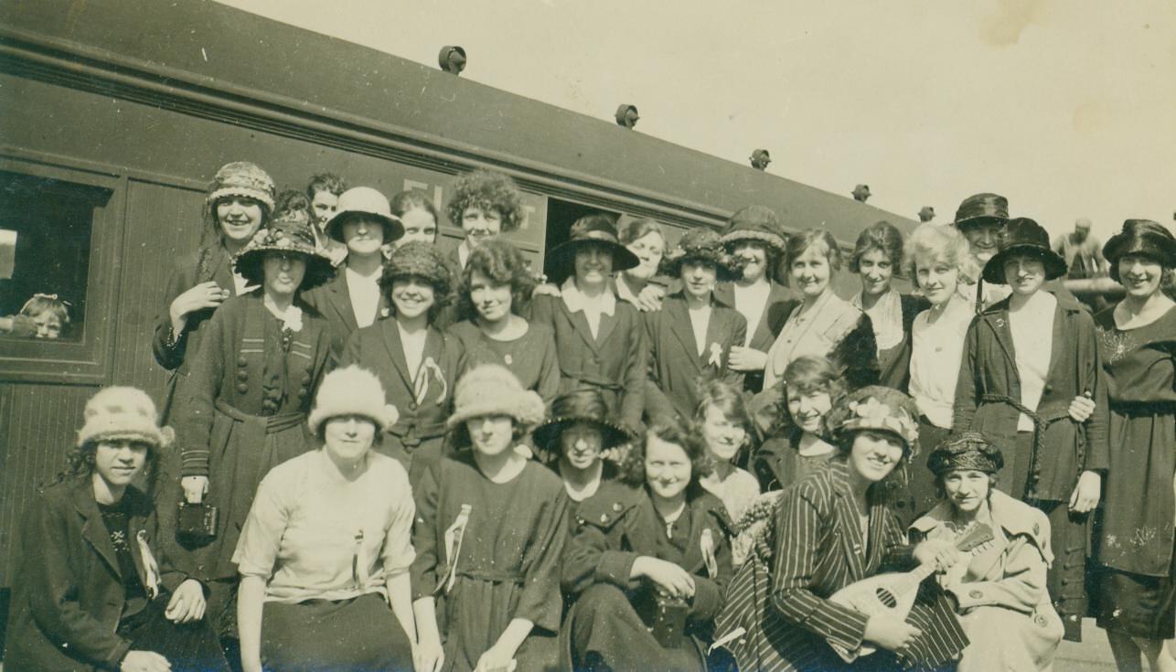 Group of women, both standing and crouching, posing in front of a stationary train. Many of the women are wearing hats and coats. Some have a pin on their lapels with ribbons. One woman, crouching second from the right, is holding a mandolin.
