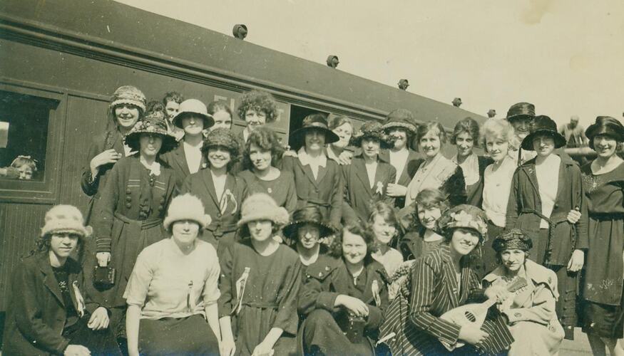 Black and white photograph of the Kodak Girls Gym Club on an excursion in the early 1920s to the Ballarat Royal South Street Eisteddford. They club is pictured here at Spencer Street Station.