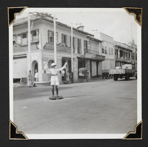A traffic policeman on a North Bridge Road corner in Singapore around the time of World War II. One of the buildings is that of S.A. Majeed & Co.