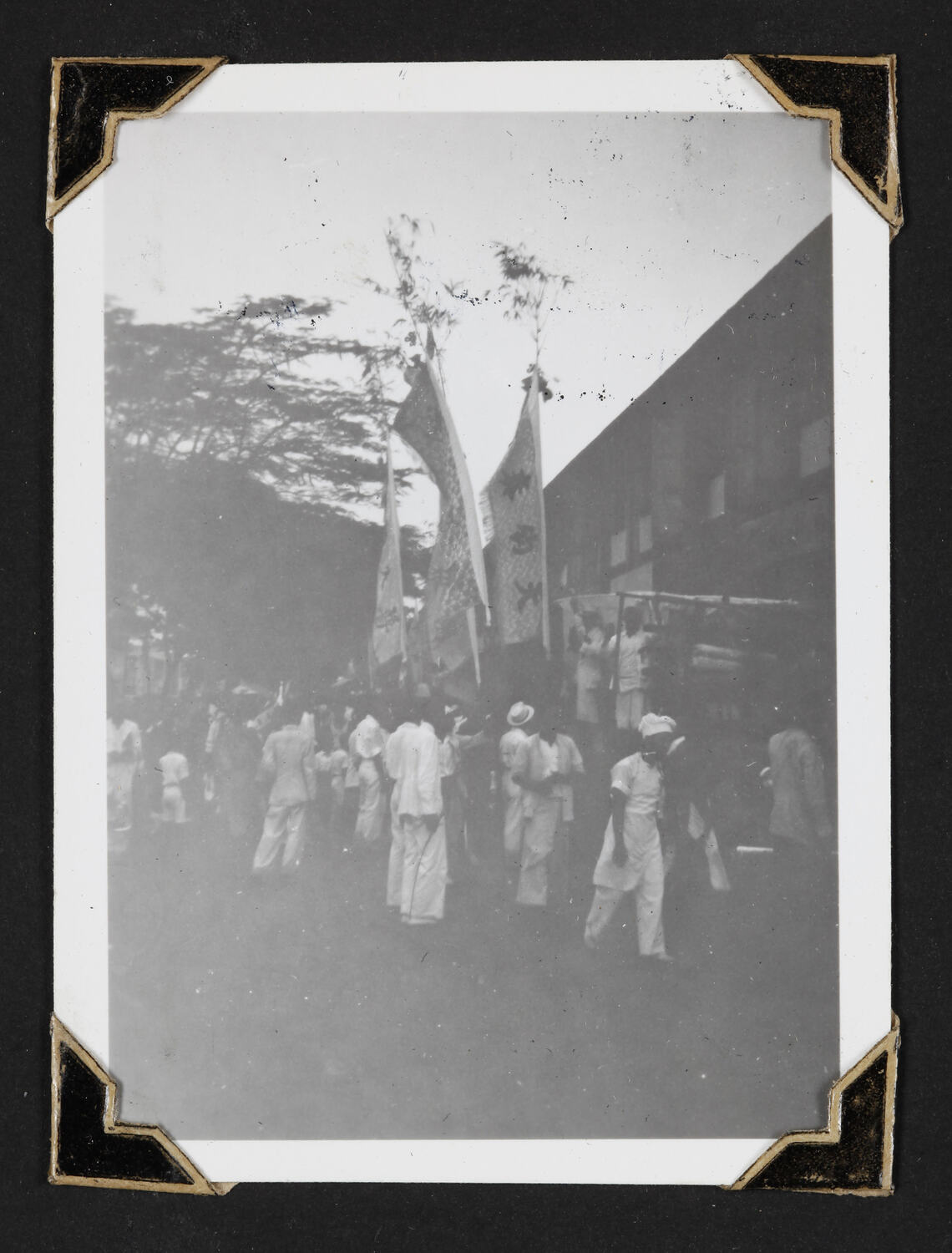 Black and white photograph of a Chinese funeral procession in Singapore.