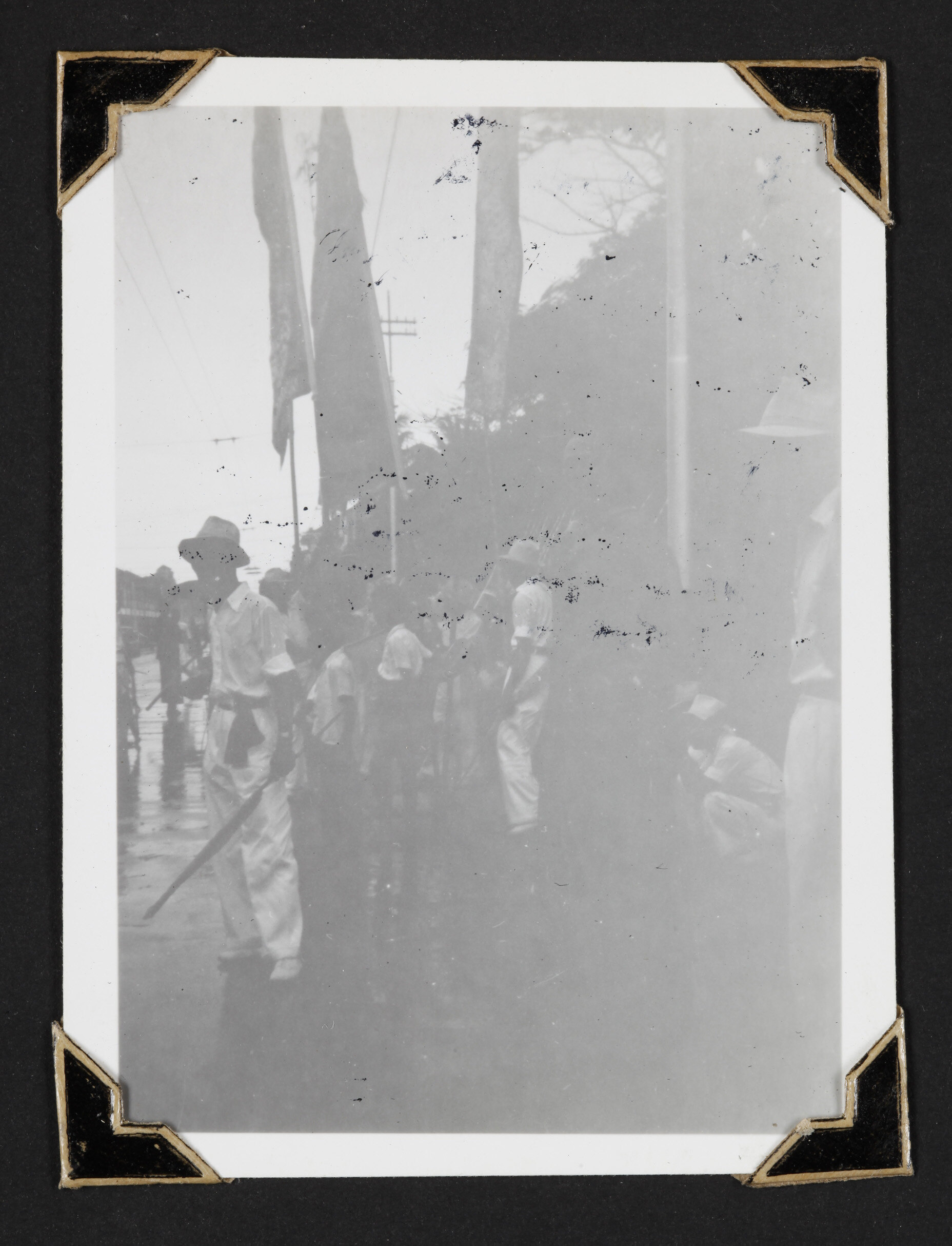Under exposed black and white photograph mounted in a photographic album.