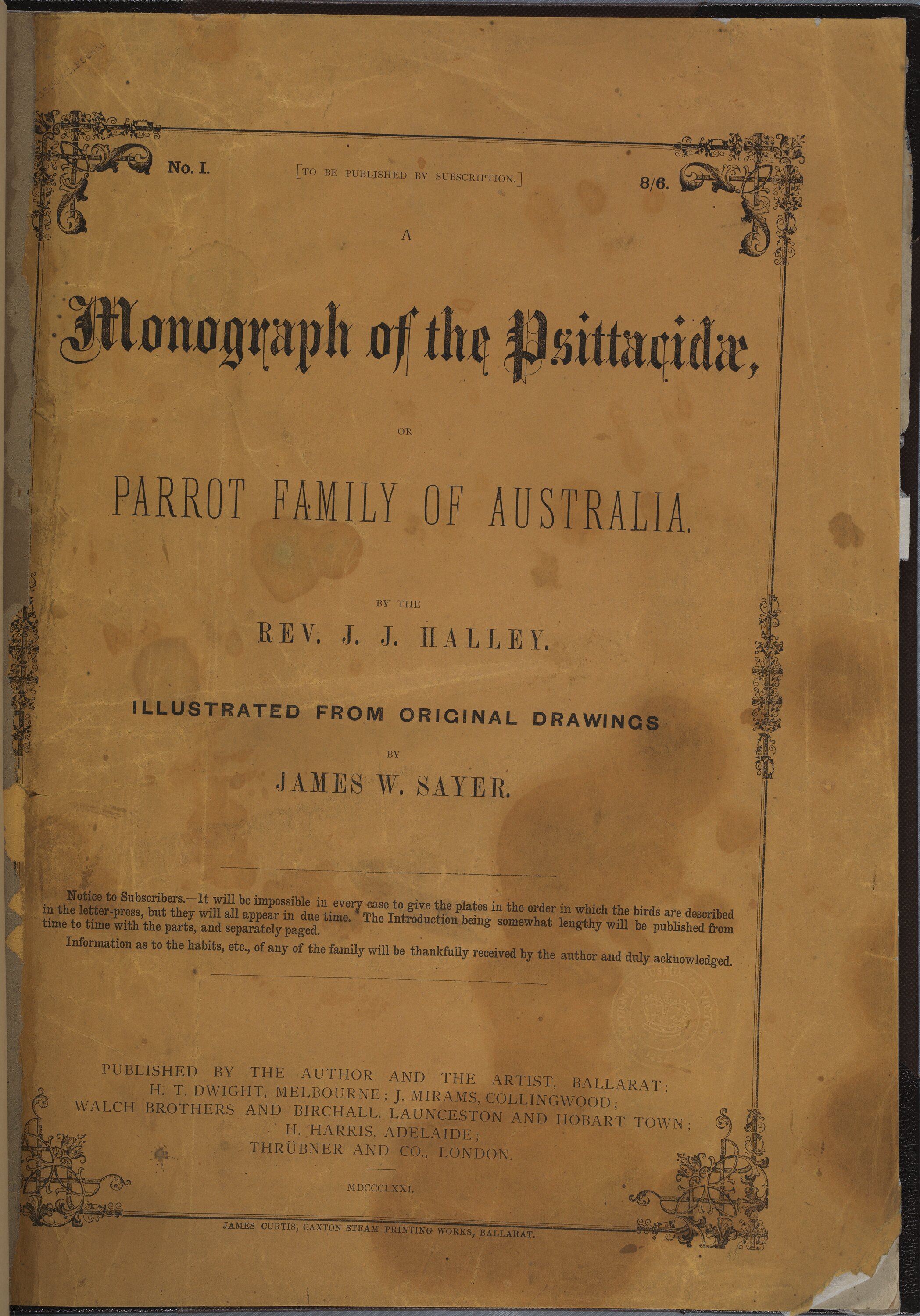 'A monograph of the Psittacidae' was printed by James Curtis in Ballarat. Halley and Sayer were the primary publishers of the work, however there are several additional publishers listed on the title page, including H. T. Dwight of Melbourne, James Mirams of Collingwood, Walch Bros of Hobart and Launceston and Birchall and Thrübner [Trübner] & Co of London, most of whom also had ties to the Congregational church. The first and only part sold for 8 shillings and sixpence.