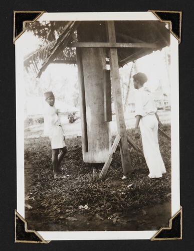 Two men standing next to an air raid alarm in Tandjoeng Kerang.