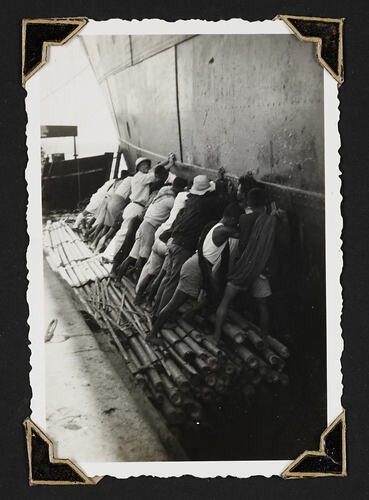 Black and white photograph of a group of men berthing SS Tanimbar.