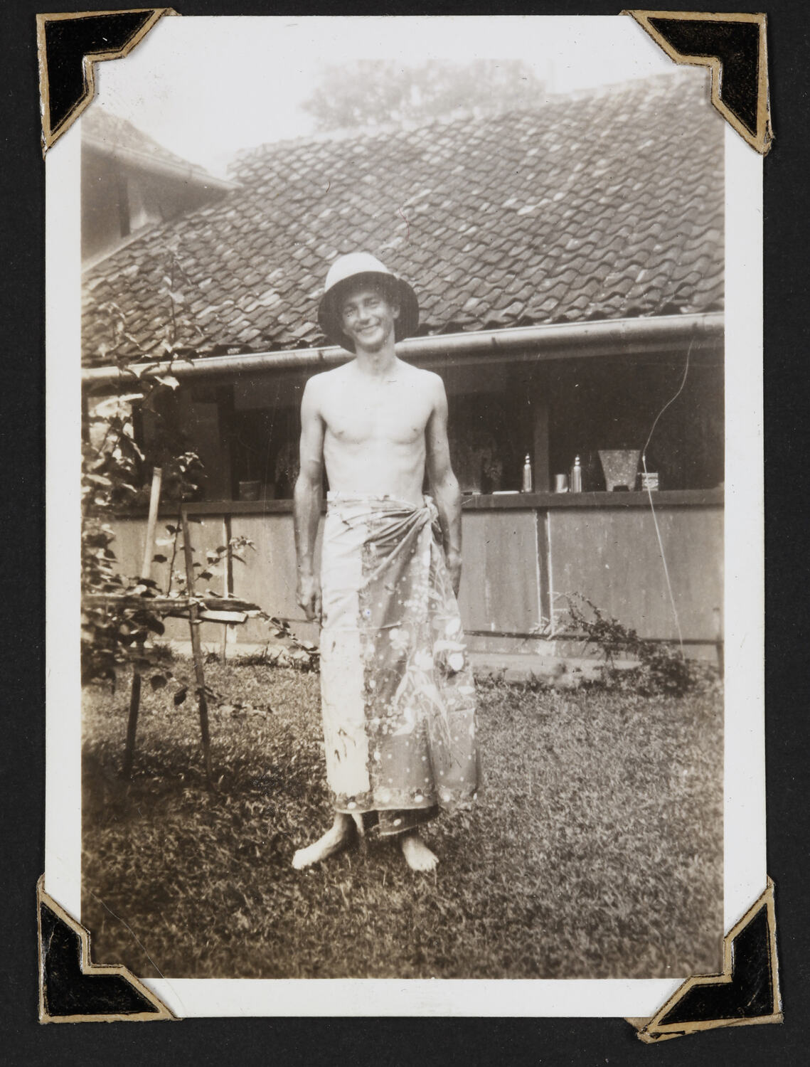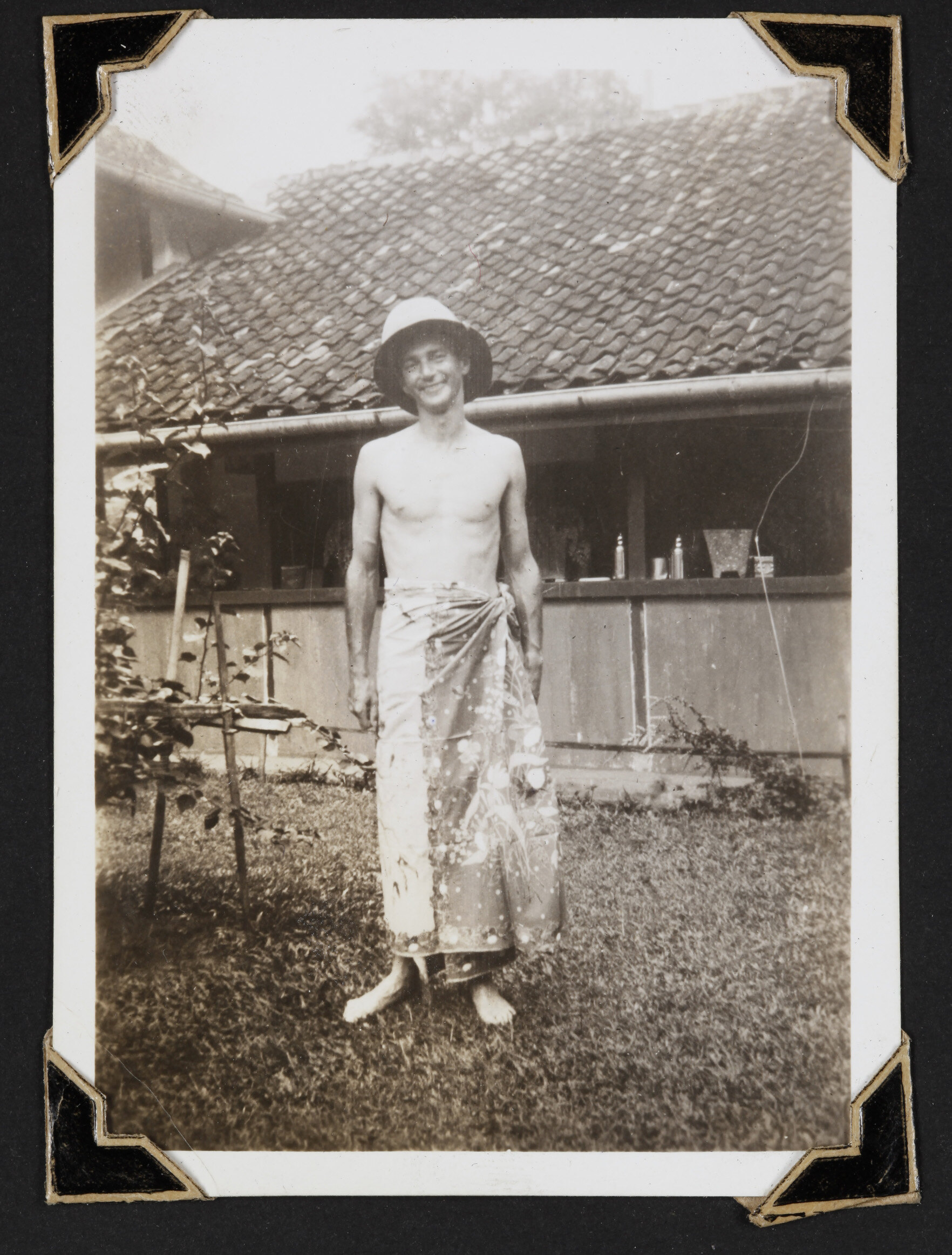 Black and white photograph of a man standing in a sarong.