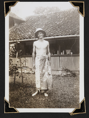 A man standing in a sarong in the grounds of Hotel Wilhelmena. Tandjoeng Kerang.