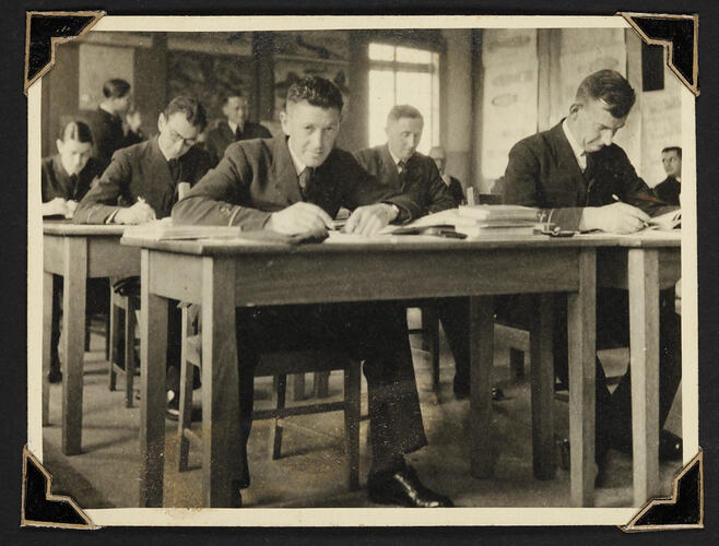 Black and white photograph of men sitting at desks in a classroom.