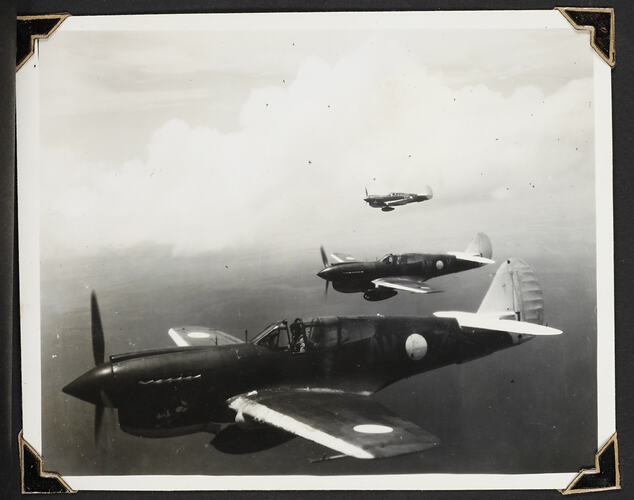 Black and white photograph of 77 Squadron Kittyhawks in the air.