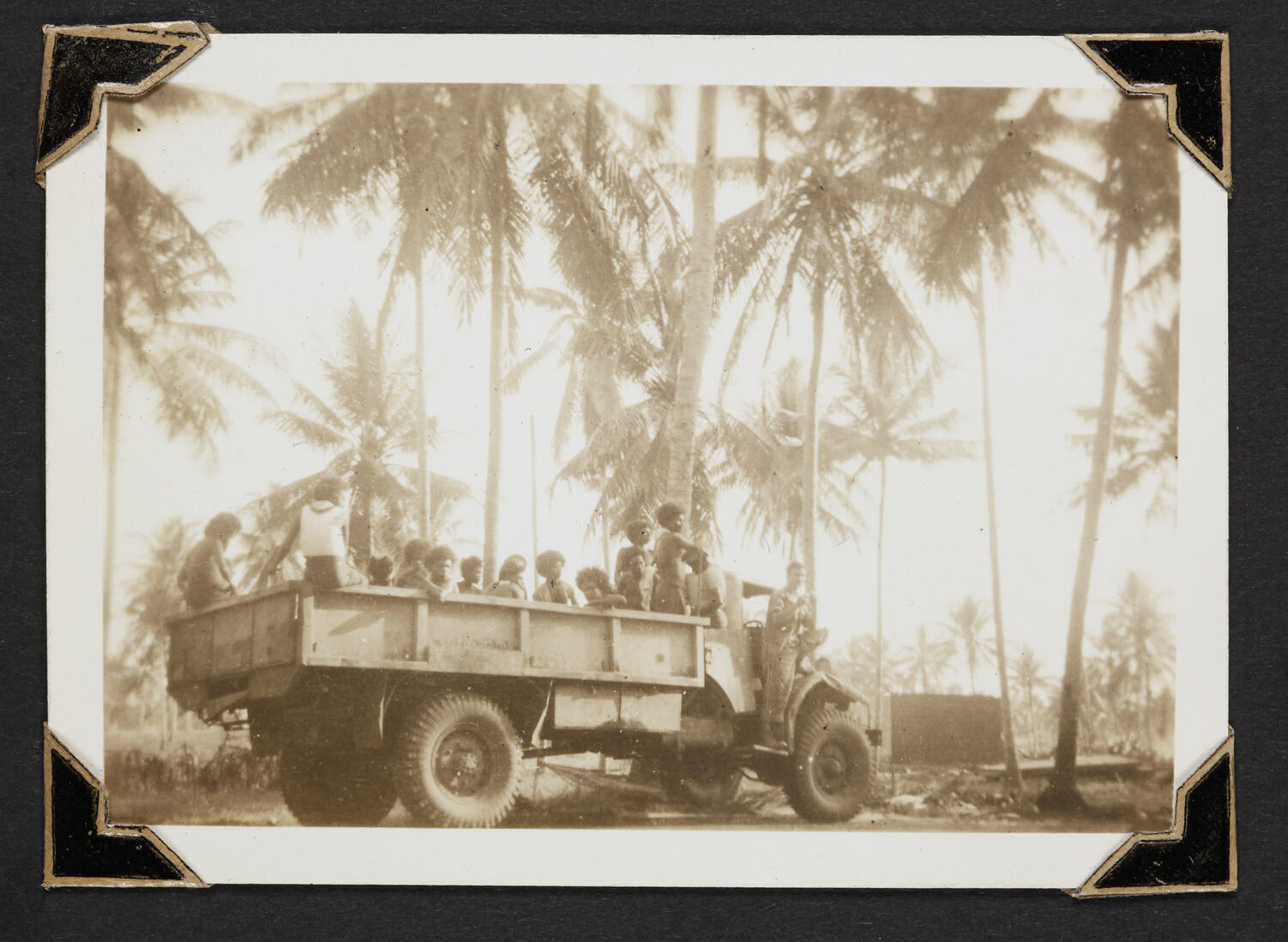 Local people standing in the trailor of a military truck at Milne Bay, New Guinea.