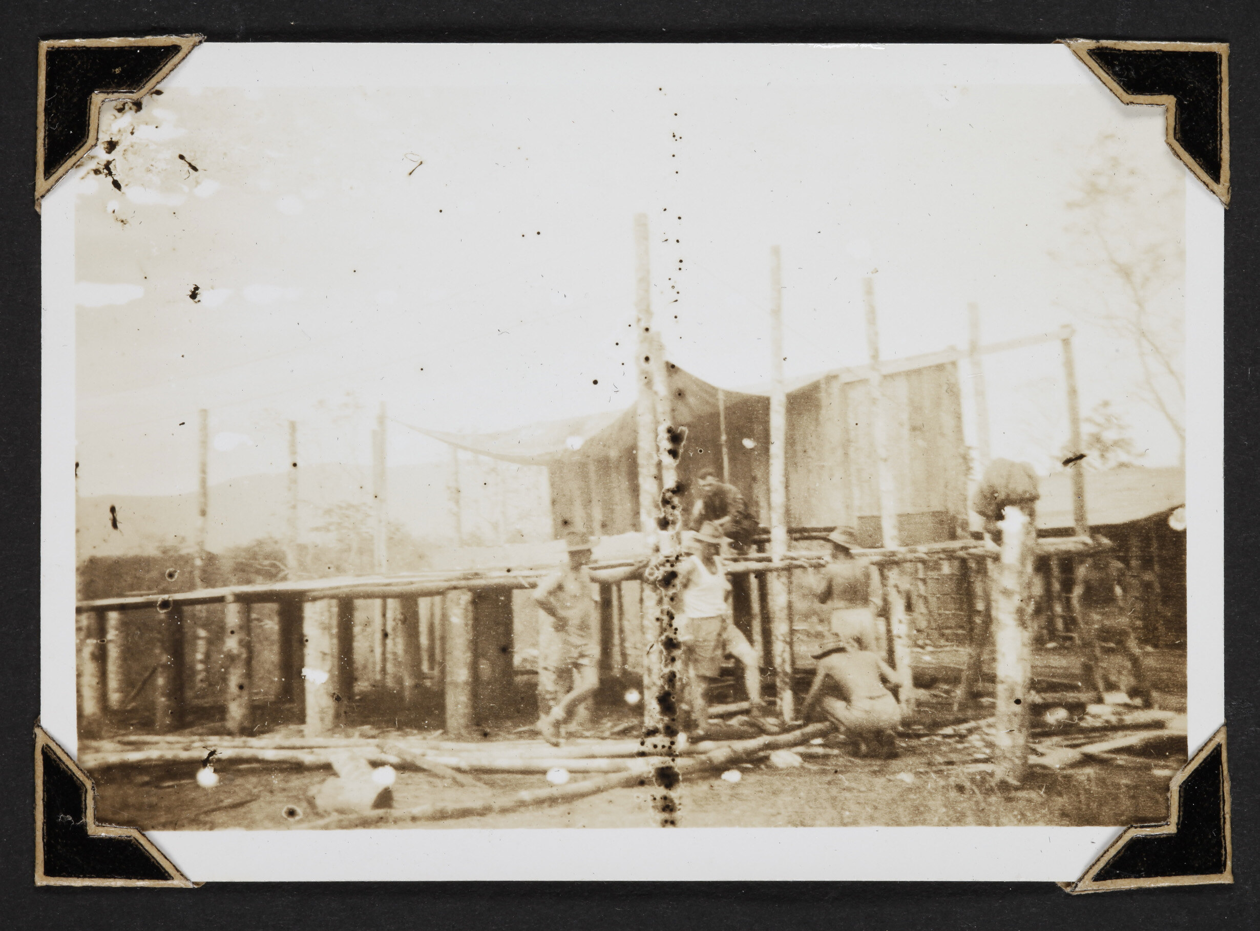 Men constructing a stage in Goodenough Island, New Guinea.