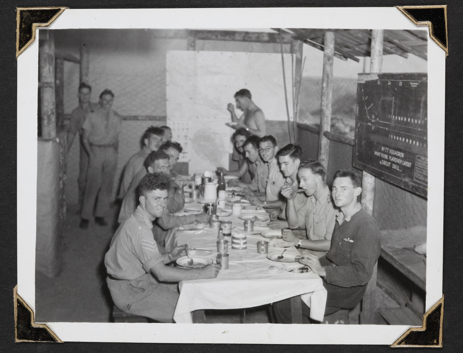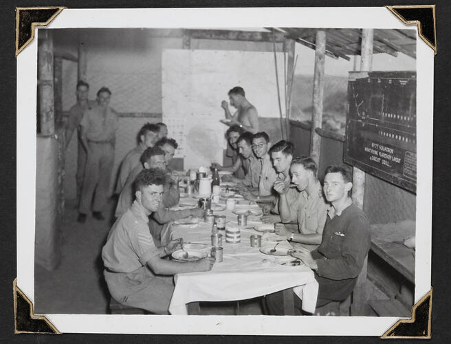 Black and white photograph of airmen eating lunch in the crew room, Goodenough Island.