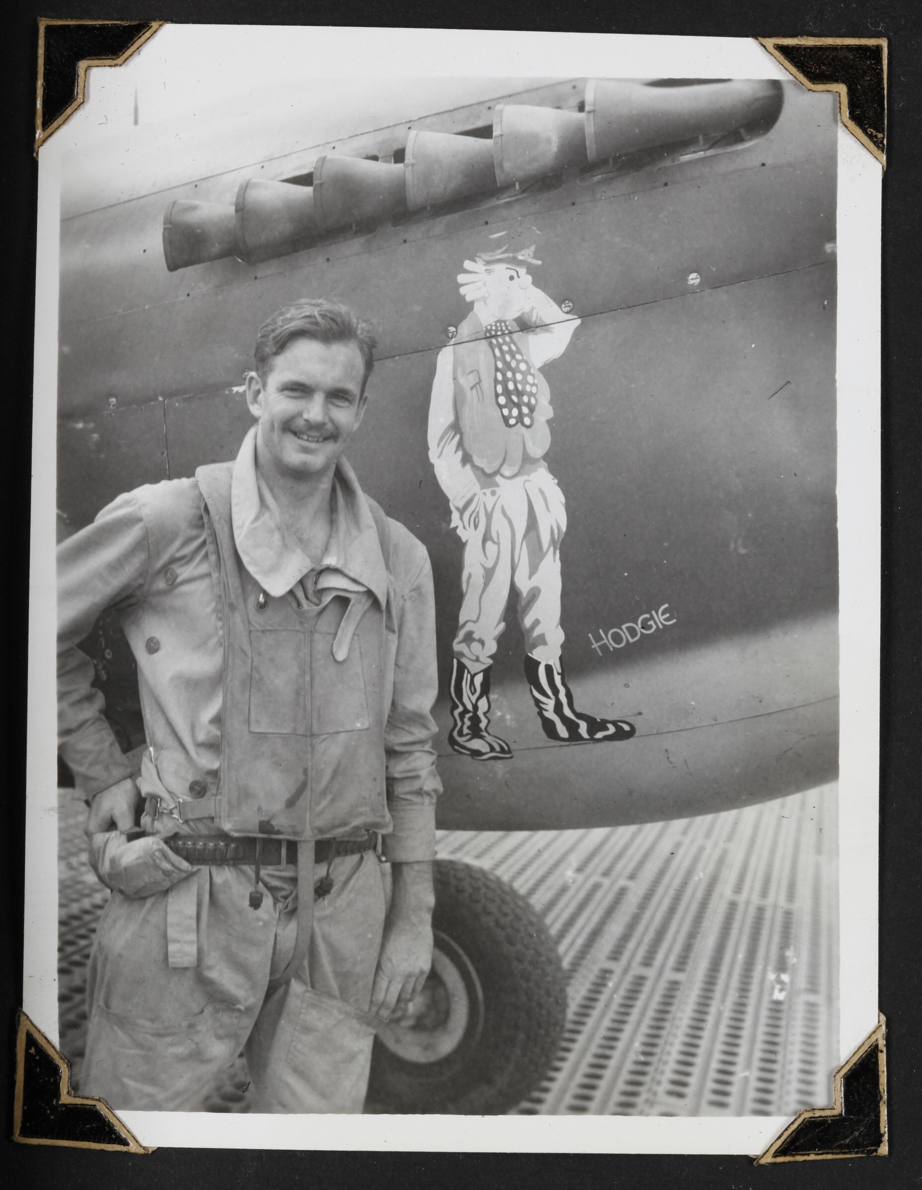 Handwritten in white ink on the album page; 'F/O. J.A.T. HODGKINSON / AND AIRCRAFT MASCOT'