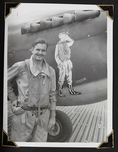 Royal Australian Air Force (RAAF) Flying Officer J.A.T Hodgkinson standing in front of artwork painted on his 77 Squadron P-40 Kittyhawk fighter in New Guinea.